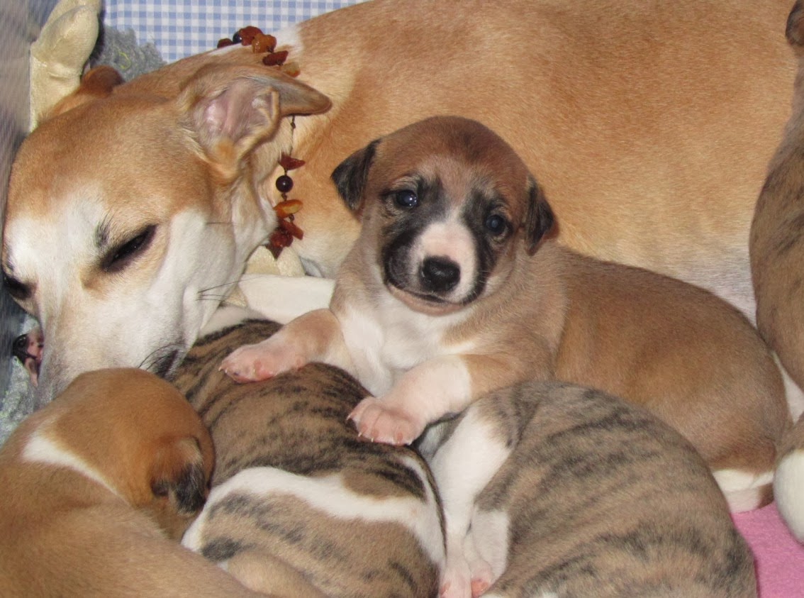 Morgen sind die Welpen 4 Wochen alt, Fanny hat sie bisher bestens mit feinster Muttermich versorgt und verdient nun wirklich ein wenig Entlastung. Heute war Gourmet Tag für die Knirpse! Vormittags durften sie das erste Mal leckeres Faschiertes vom Bio Weiderind kosten. Wie das köstlich schmeckte! Alle bis auf Edward, der keinen Appetit auf etwas Herzhaftes hatte und lieber Mamas Milchshakes bevorzugte, ließen es sich schmecken und fraßen das gute Fleisch mit großem Appetit. Am Abend gab es dann den ersten Ziegenmilchbrei mit ein wenig Lein- und Kokosöl. Bemerkenswert brav und beinnahe ganz ohne zu kleckern, schlabberten die Kleinen den Brei.